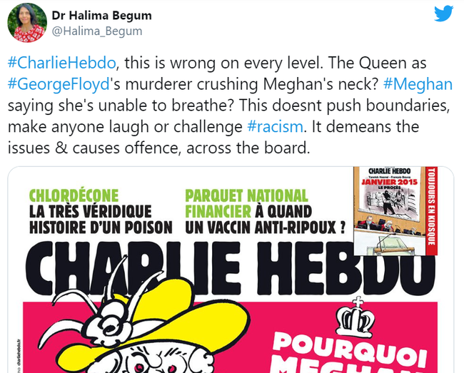 Tiến sĩ Halima Begum - Giám đốc điều hành của tổ chức bình đẳng chủng tộc Runnymede đã tweet: "Charlie Hebdo, điều này sai ở mọi cấp độ. Sao có thể vẽ Nữ hoàng đè lên cổ Meghan như cách mà viên cảnh sát sát hại George Floyd? Meghan nói rằng cô ấy không thể thở ư? Điều này không khiến bất kỳ ai có thể cười hoặc thách thức sự phân biệt chủng tộc. Nó chỉ đang tạo ra những vấn đề và gây nên sự xúc phạm to lớn mà thôi".