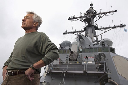 | Cựu bộ trưởng quốc phòng Mỹ Chuck Hagel trong một chuyến thăm tàu khu trục USS Stethem - Ảnh: Reuters |