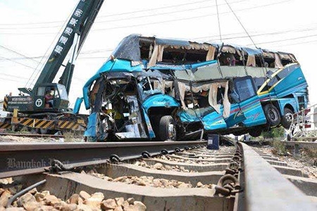 Một đoàn tàu đã lao vào một chiếc xe buýt hai tầng đang chở khách du lịch tại một điểm giao nhau giữa đường sắt và đường bộ không có rào chắn ở miền trung Thái Lan.