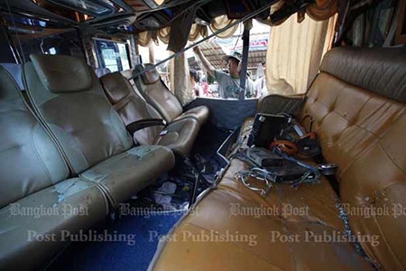 Chiếc xe buýt đã bị nát tươm sau vụ tai nạn. (Ảnh: Bangkok Post) |