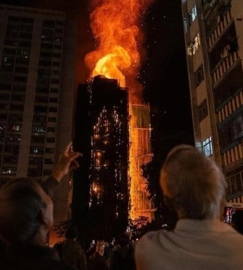 Thảm kịch xảy ra chiều 26/11 khi lửa bùng phát từ hệ thống giàn giáo tre phủ quanh tòa nhà đang được cải tạo. Lưới nhựa, tấm che và vật liệu xốp bao quanh các tầng đã khiến ngọn lửa lan nhanh lên mặt ngoài tòa nhà, chỉ trong vài phút đã bao trùm nhiều tầng cao.
