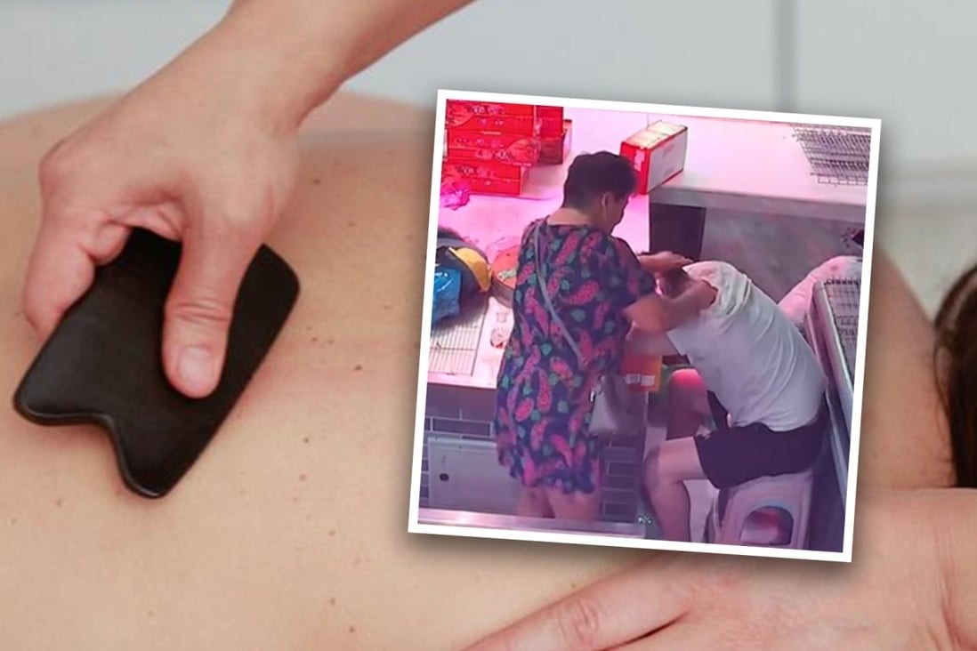 Thời điểm người đàn ông vừa chợp mắt, một người phụ nữ tình cờ đi ngang qua liền vội vã lấy một chiếc đồng xu ra rồi tiến hành cạo gió ở lưng cho người đàn ông nhưng anh Vũ vẫn không tỉnh.