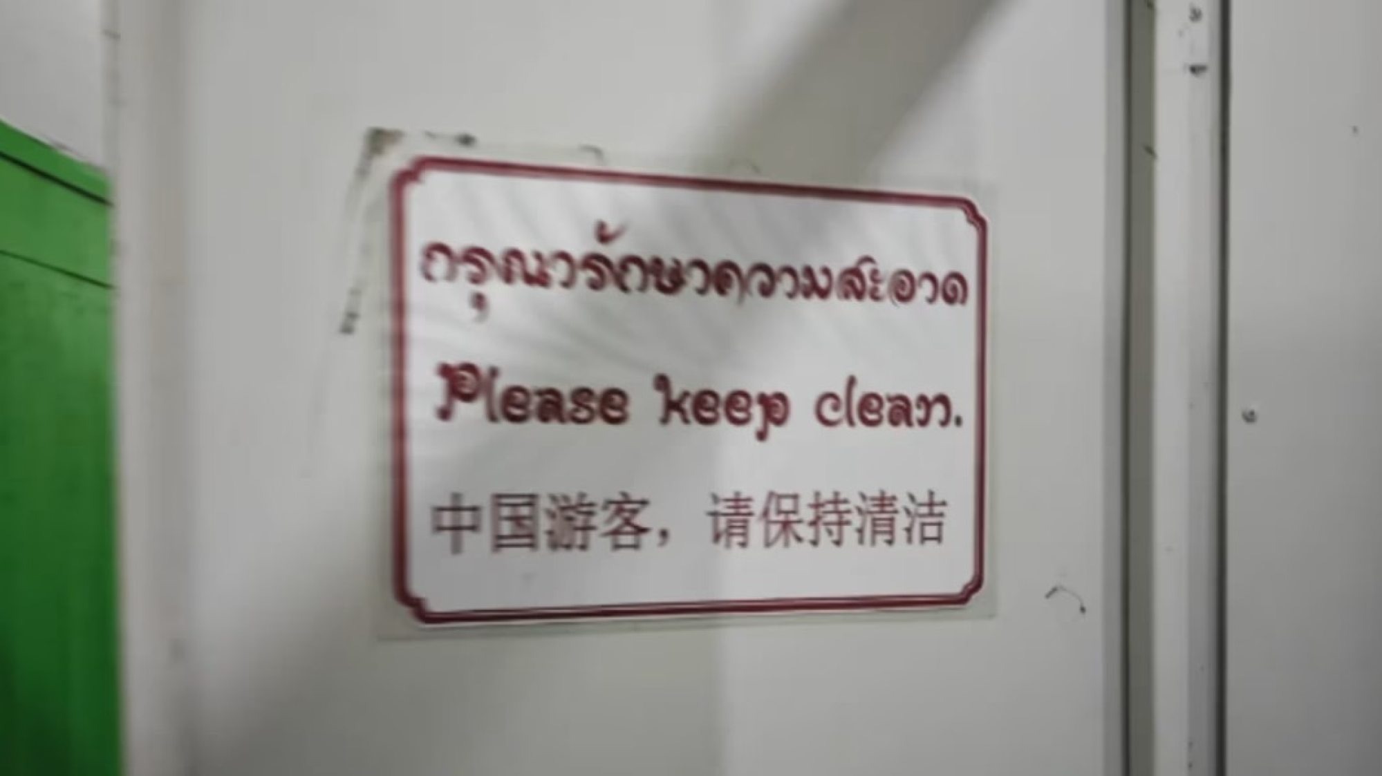 Tấm biển bằng tiếng Thái và tiếng Anh có dòng chữ: “Xin giữ gìn vệ sinh sạch sẽ” nhưng phiên bản tiếng Trung lại có nội dung: “Du khách Trung Quốc, xin giữ gìn vệ sinh sạch sẽ”.