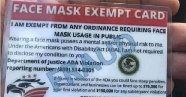 Theo CBS News, các quan chức liên bang Mỹ đang cảnh báo rằng các tấm thẻ cấp quyền miễn đeo khẩu trang ở nơi công cộng cho người dân đều là giả mạo. Những tấm thẻ này có logo in hình đại bàng, có một số thông điệp với nhiều lỗi chính tả nói rằng những người đeo thẻ có quyền từ chối đeo khẩu trang ở nơi công cộng mặc dù đây là hình thức được các chuyên gia y tế khuyến nghị để chống virus corona.