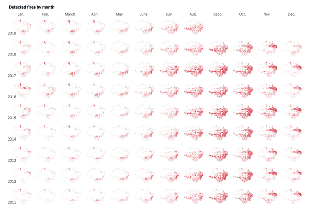 Biểu đồ dưới đây cũng là một bằng chứng khó mà chối cãi. Nó cho thấy tần suất cháy rừng theo từng tháng xuyên suốt rừng mua Amazon theo từng năm kể từ 2011. Có thể thấy, cháy rừng xảy ra chủ yếu vào mùa khô - giai đoạn tháng 8 đến tháng 10, trùng với thời điểm nông dân chuẩn bị trồng vụ mới.