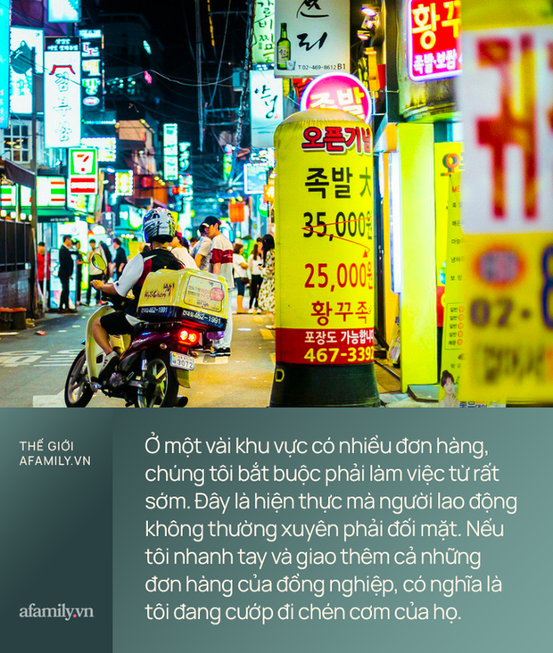 "Ở một vài khu vực có nhiều đơn hàng, chúng tôi bắt buộc phải làm việc từ rất sớm. Đây là hiện thực mà người lao động không thường xuyên phải đối mặt. Nếu tôi nhanh tay và giao thêm cả những đơn hàng của đồng nghiệp, có nghĩa là tôi đang cướp đi chén cơm của họ" - Ha Woong nói thêm.