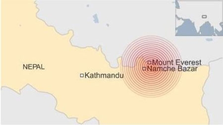 | Tâm chấn của trận động đất nằm gần núi Everest (Ảnh: BBC) |