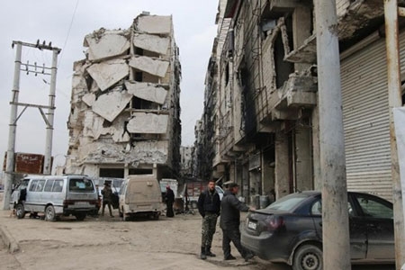 | Những tòa nhà bị hư hại nặng nề ở Aleppo, Syria. Ảnh: AP |