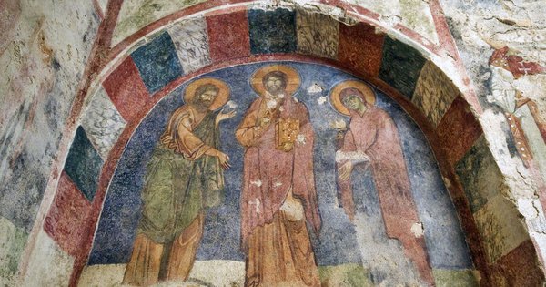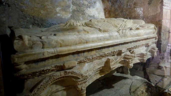 Theo tiến sĩ Osman Eravşar, Chủ tịch Hội đồng Bảo tồn di sản văn hóa Khu vực Antalya, đó chính là bên dưới bức bích họa nổi tiếng mô tả Chúa Jesus đang cầm quyển kinh thánh trên tay trái và dùng tay phải làm dấu hiệu ban phước.