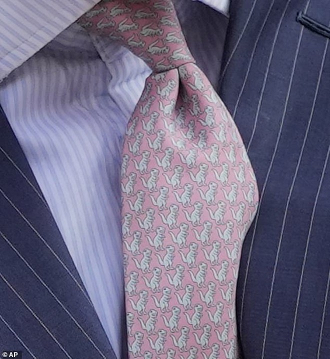 Khi Nhà vua Charles III bước vào Trung tâm Ung thư Macmillan tại Bệnh viện Đại học London, sự phấn khích của ông được thể hiện rõ qua chiếc cà vạt T-Rex đặc sắc. Chiếc cà vạt màu hồng được trang trí bởi những hình ảnh khủng long T-Rex màu xanh, không chỉ là sự chơi chữ ngộ nghĩnh từ chữ ký chính thức 'Charles III Rex' mà còn phản ánh tâm trạng lạc quan và yêu đời của ông.