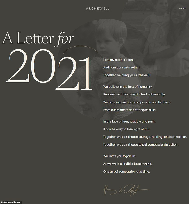 Trước đó, nhà Sussex gây chú ý khi ra mắt trang web Archewell với lá thư chào năm 2021 in hình ảnh Harry ngồi trên vai mẹ được chụp vào tháng 7/1986. Harry nhắc đến mẹ mình trong bức thư mở màn năm mới nhưng không hề nhắc đến tên cha. Một chuyên gia hoàng gia cho hay, Hoàng tử William lo ngại rằng Harry "dường như đang khai thác giá trị biểu tượng của mẹ" để đánh bóng tên tuổi.