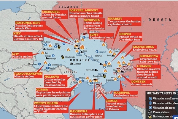 Hôm qua (24/2), Nga phát động một "chiến dịch đặc biệt" để bảo vệ người dân, gồm cả người Nga, đang ở Ukraina bằng đường bộ, đường không và đường biển. Phương Tây cho rằng Tổng thống Putin đã đưa ra những buộc tội vô căn cứ và hành động của Nga là cuộc tấn công lớn nhất nhằm vào một quốc gia châu Âu kể từ Thế chiến II.