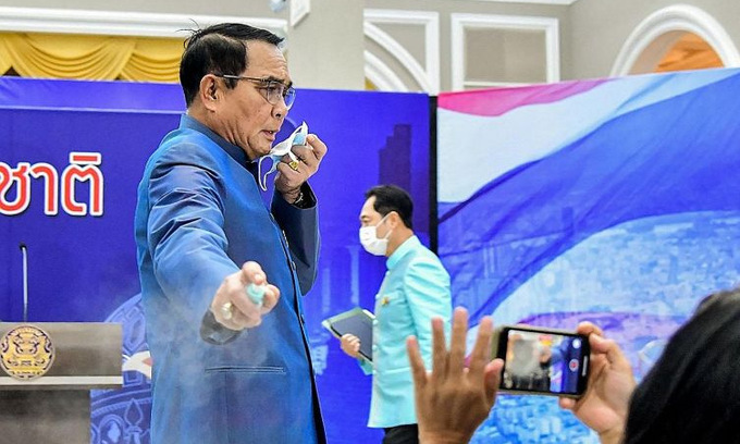 "Còn điều gì khác để hỏi không", Thủ tướng Prayut hỏi trước khi rời bục phát biểu, cầm chai dung dịch cồn sát khuẩn loại nhỏ, đi đến chỗ các phóng viên và xịt vào từng người, trong khi ông cầm khẩu trang che miệng. Ông sau đó nói chuyện với một nhóm nhà báo, tiếp tục xịt cồn sát khuẩn vào họ và rời đi.