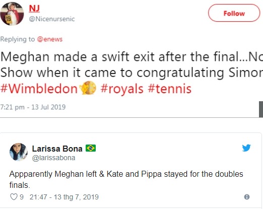 "Meghan đã đi đâu rồi, tại sao không thấy cô ấy chúc mừng người chiến thắng. Tôi chỉ thấy Kate", "Rõ ràng Meghan Markle đã tự ý rời đi để lại Kate cùng em gái xem nốt trận chung kết đôi nam", người dùng mạng bình luận về sự biến mất bất thường của Meghan Markle.