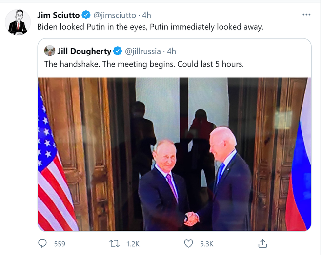 Cụ thể, phóng viên Jim Sciutto của CNN đã nói rằng hai ông Biden và Putin "có vẻ mặt nghiêm nghị, không giao tiếp bằng mắt" với đối phương. Ông này sau đó đã chia sẻ khoảnh khắc hai nhà lãnh đạo bắt tay và bình luận: "Ông Biden nhìn vào mắt ông Putin, ông Putin liền ngoảnh mặt đi"; và một tấm hình khác có lời bình luận rằng cả hai nhà lãnh đạo không hề hé nụ cười.