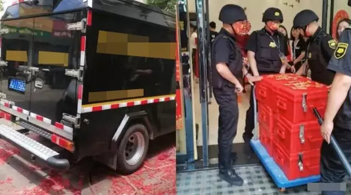 Global Times mô tả chàng thanh niên họ Yan, 30 tuổi đã thuê chiếc xe bọc thép và 4 vệ sĩ để chuyển 6 két đều được dán màu sặc sỡ tới nhà hôn thê.