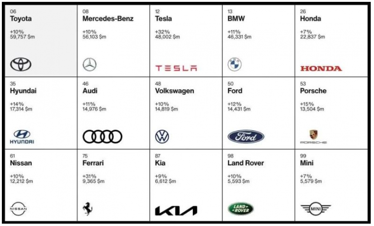 Interbrand - công ty tư vấn đánh giá thương hiệu của Mỹ vừa công bố danh sách các thương hiệu giá trị nhất năm 2022 và Toyota một lần nữa đứng đầu danh sách các thương hiệu ô tô giá trị nhất với giá trị thương hiệu là 59,757 tỷ USD. Con số này cho thấy giá trị thương hiệu tăng 10% so với năm 2021, đưa Toyota vào vị trí thứ 6 trong Top 100 Thương hiệu toàn cầu tốt nhất (tăng 1 bậc so với năm trước).