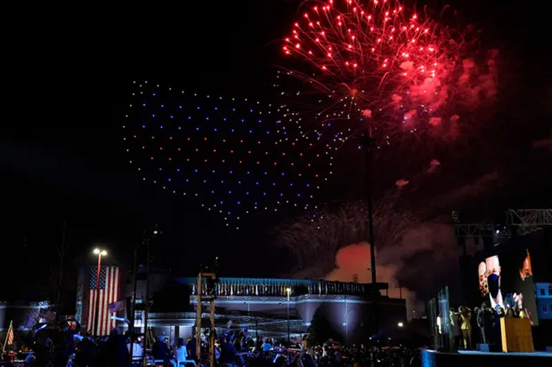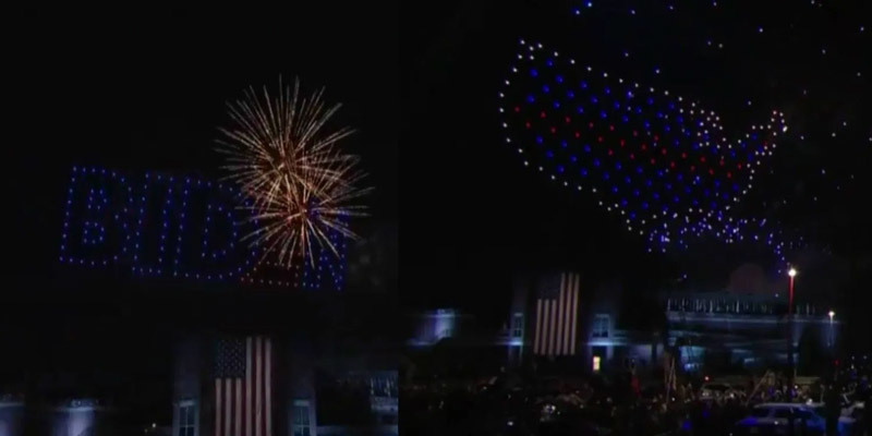 Tiếp đó, dàn máy bay không người lái kỳ công tạo thành hình logo chiến dịch tranh cử tổng thống 2020 của ông Biden, dòng chữ "tổng thống đắc cử", tên của ông Biden và số 46 (ám chỉ ông là lãnh đạo Nhà Trắng thứ 46).