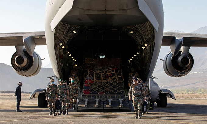 Một vận tải cơ cỡ lớn của không quân Ấn Độ sáng 15/9 hạ cánh xuống căn cứ tiền phương ở Ladakh, chở theo các binh sĩ cùng vật tư, trong lúc tiêm kích tiếp tục quần thảo trên bầu trời. Các binh sĩ đeo ba lô bước ra ngoài, được kiểm tra triệu chứng Covid-19 tại một cơ sở trung chuyển và chờ được đưa tới đơn vị.
