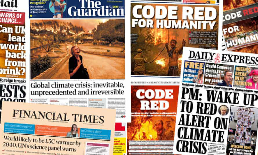 Dòng tiêu đề của The Guardian là "Khủng hoảng khí hậu toàn cầu: Không thể tránh khỏi, chưa từng có và không thể đảo ngược"; "Kìa Thủ tướng: Hãy thức dậy xem báo động đỏ về khủng hoảng khí hậu" là tựa đề trên trang nhất Daily Express; "Báo cáo về ngày tận thế cảnh báo về biến đổi khí hậu: Liệu Vương quốc Anh có thể dẫn dắt thế giới trở lại từ bờ vực không?" - Tờ Daily Mail hỏi.