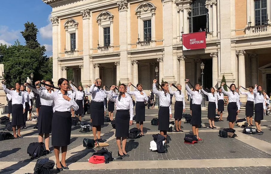 50 cựu tiếp viên hàng không của hãng Alitalia đã tham gia cuộc biểu tình diễn ra tại Đồi Campidoglio ở Rome, theo CNN.