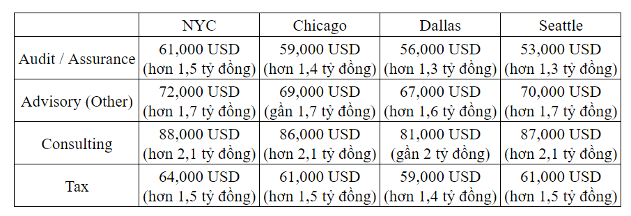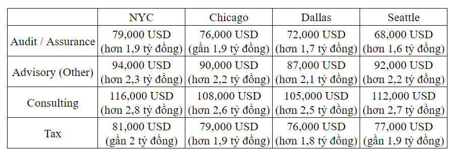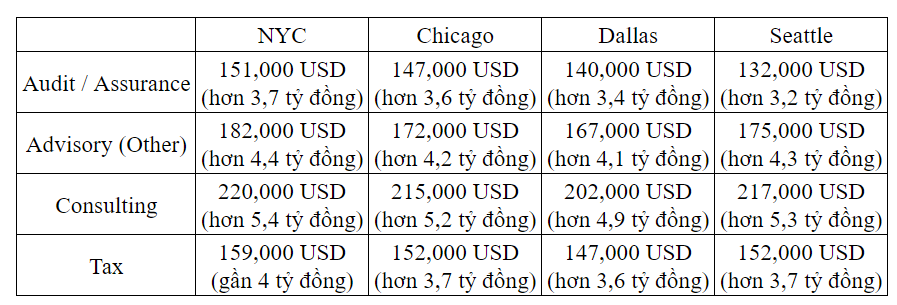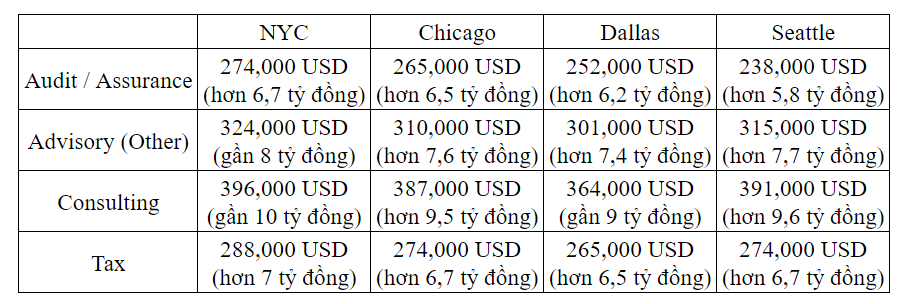 Để giải đáp thắc mắc này, trang managementconsulted.com đã thống kê mức lương của 4 công ty kiểm toán lớn nhất thế giới tại 4 thành phố lớn tại Mỹ là: New York, Chicago, Dallas và Seattle theo cập nhật mới nhất năm 2024.