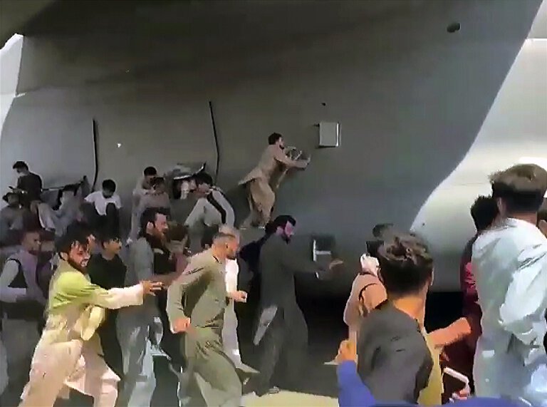 Thời điểm đó, rất đông người Afghanistan đã trèo lên cánh máy bay, và thậm chí vào bộ phận càng đáp. Phi hành đoàn được cho là không hay biết về điều này.