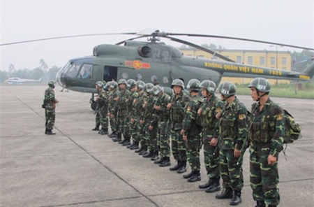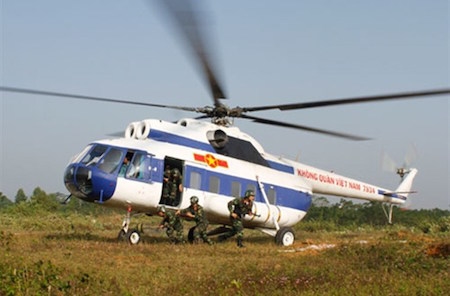 Ảnh: Trực thăng Mi-8 của Trung đoàn 916 hỗ trợ đơn vị đặc công diễn tập đánh địch đổ bộ đường không. |