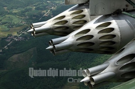 Hình ảnh chụp ba trong 6 giàn phóng rocket trên trực thăng Mi-17 của Đoàn 916 tham gia diễn tập bắn đạn thật ở Thanh Hóa 2015. |
