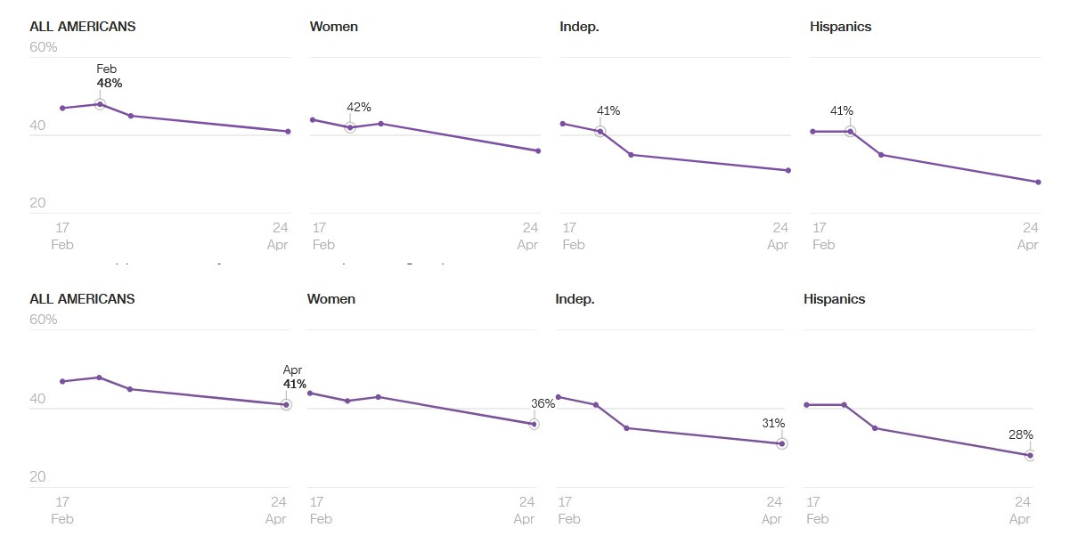 Theo khảo sát, tỷ lệ ủng hộ dành cho Tổng thống Trump đạt đỉnh trong tháng Hai là 48%. Tuy nhiên, tỷ lệ trên đã giảm dần xuống 45% trong tháng Ba và xuống còn 41% tính đến ngày 24/4.