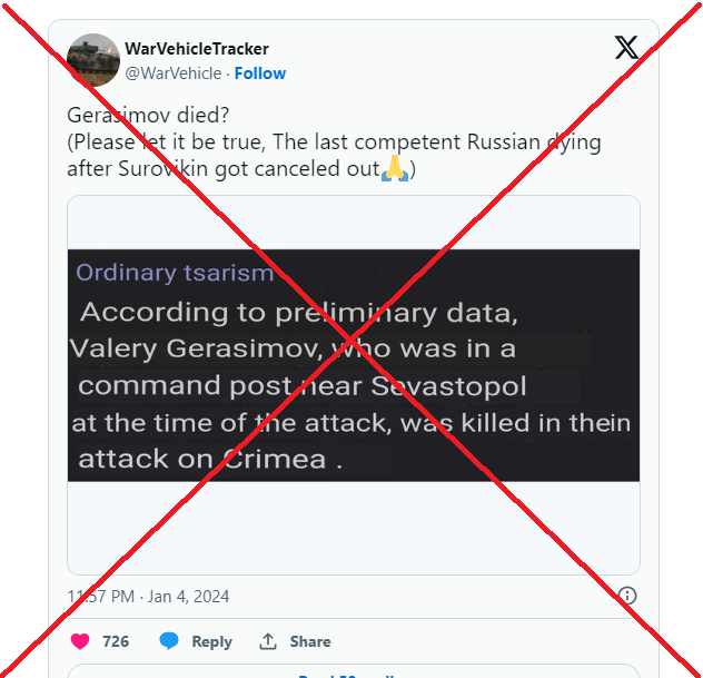 Hình ảnh này chụp lại một đoạn thông tin do kênh Telegram "Ordinary Tsarism" tại Nga, với hơn 34.000 người theo dõi, đăng tải. Nội dung là: "Theo dữ liệu sơ bộ, Đại tướng Valery Gerasimov – người đã có mặt tại trạm chỉ huy gần Sevastopol tại thời điểm diễn ra vụ tấn công – đã thiệt mạng".