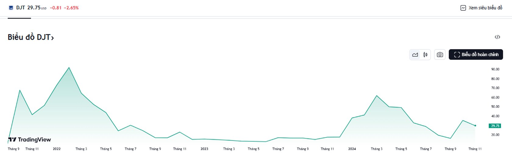 Trước khi lao dốc mất gần 44% trong 5 phiên vừa qua, DJT từng có đợt tăng gấp hơn 4 lần, từ mức giá hơn 12 USD trong tuần cuối tháng 9 lên trên 54 USD/cp vào cuối tháng 10 vừa qua.