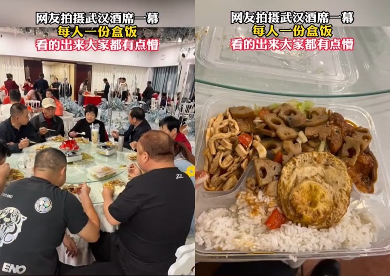 Đoạn video ghi lại cảnh khách dự đám cưới tại một khách sạn sang trọng ở thành phố Vũ Hán, tỉnh Hồ Bắc, Trung Quốc đang phải ngồi ăn bữa cơm được đóng trong hộp xốp trên chiếc bàn khác trống trơn đã khiến cư dân mạng đại lục không khỏi kinh ngạc. Đoạn video cũng cho thấy những vị khách vừa ngồi ăn vừa phải cố nhịn cười khi ống kính quay tới mình.
