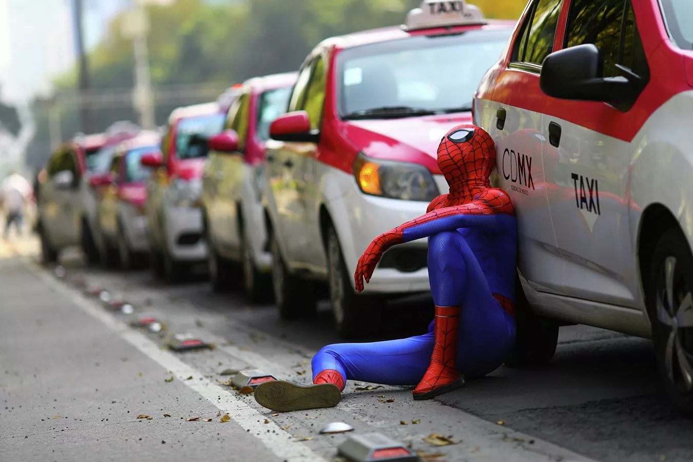 Một người đàn ông hóa trang thành “Người Nhện” bên chiếc xe taxi trong cuộc biểu tình của các tài xế taxi phản đối các ứng dụng đặt xe trên điện thoại di động ở Mexico City, Mexico.