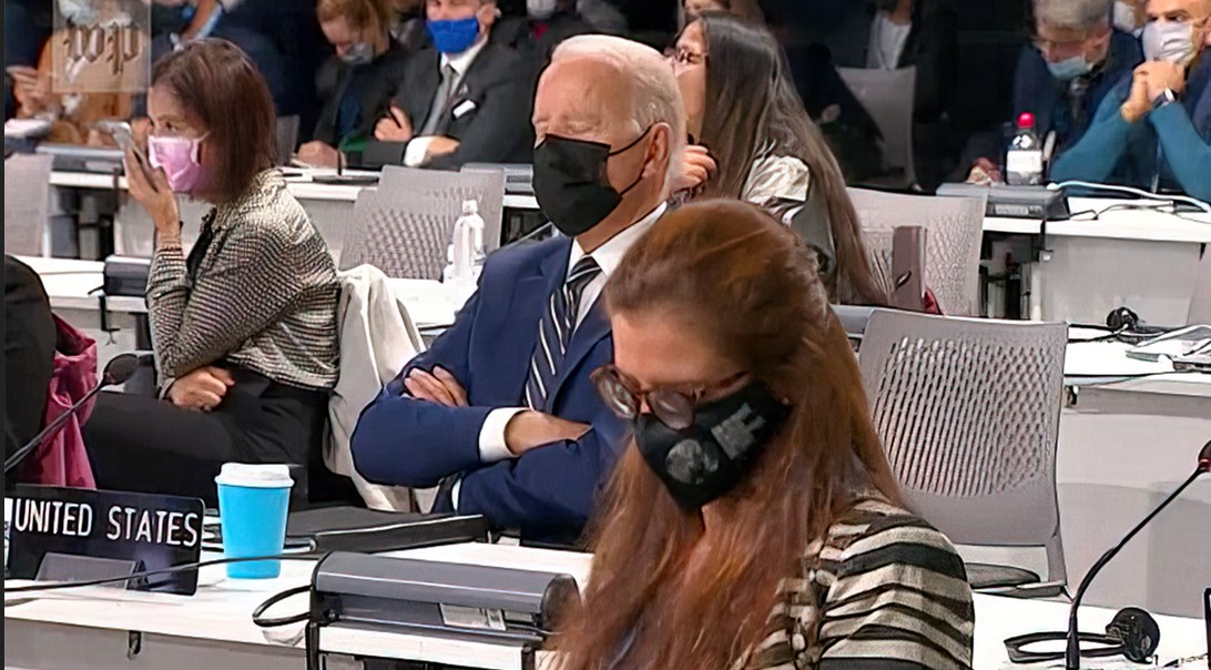 "Ôi trời, dường như ông Biden đã ngủ gật trong hội nghị về khí hậu, và một trợ lý phải tới để gọi ông ấy," tài khoản Twitter Comfortably Smug bình luận.