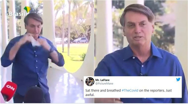 Đeo một chiếc khẩu trang trắng đơn giản, Tổng thống Bolsonaro trông bình thản khi khẳng định với các phóng viên rằng triệu chứng Covid-19 của ông không nghiêm trọng và "không có lý do gì để sợ hãi". Có thời điểm, nhà lãnh đạo Brazil yêu cầu phóng viên lùi lại vài bước, trước khi tháo khẩu trang để nói vài lời động viên.