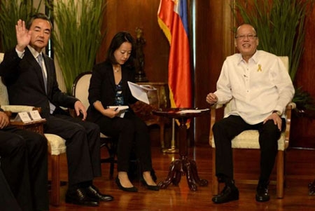 Ngoại trưởng Trung Quốc Vương Nghị và Tổng thống Philippines Benigno Aquino (phải) trong cuộc gặp hôm nay ở Manila. |