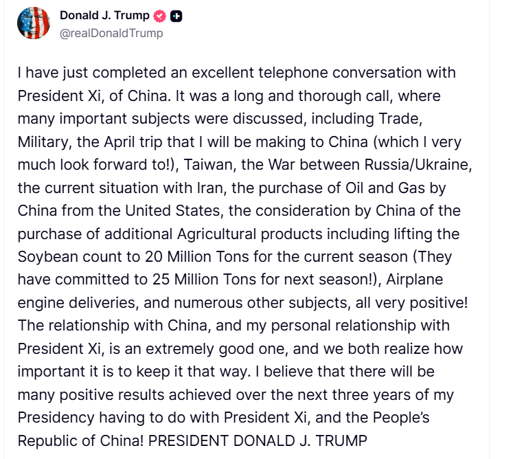 Trên nền tảng Truth Social, Tổng thống Donald Trump mô tả cuộc đối thoại với Chủ tịch Tập Cận Bình là "rất tuyệt vời". Ông nhấn mạnh rằng cả hai nhà lãnh đạo đều coi trọng việc duy trì mối quan hệ cá nhân nồng ấm cũng như sự ổn định trong quan hệ song phương Mỹ - Trung.