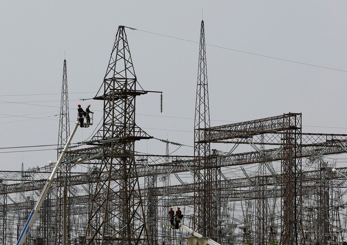 Ảnh chụp công nhân làm việc tại mạng lưới điện gần nhà máy hạt nhân Zaporizhzhia hôm 22-8. Ảnh: Reuters