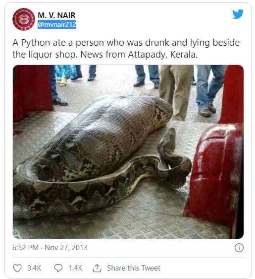 Vào tháng 11/2013, mạng xã hội thế giới xôn xao với bài đăng của người dùng Twitter sở hữu tài khoản @mvnair212 nói về một người đàn ông say xỉn ở Attapady, Kerala, Ấn Độ, bị con trăn khổng lồ nuốt chửng khi đang nằm ngủ bên cạnh một cửa hàng bán rượu. Bài đăng kèm với bức ảnh ấn tượng cho thấy con vật khổng lồ nằm nghỉ mệt sau khi xơi tái con mồi ngon, lập tức thu hút sự chú ý của đông đảo dân mạng.
