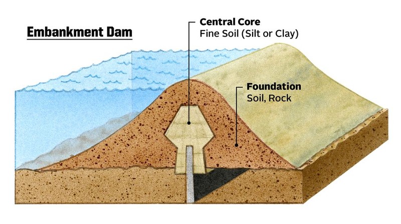 Lõi của con đập được tạo thành từ hàng tấn đất sét, phần lớn không thấm nước, được bao bọc bởi một lớp vỏ cát dày. Con đập cao tám tầng, có nhiệm vụ giữ 158 tỷ gallon nước - tương đương 240.000 bể bơi cỡ Olympic - không đổ xuống các ngôi làng bên dưới.