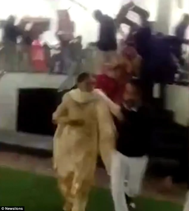 Một người đàn ông được nhìn thấy đang đánh vào đầu một thanh niên trẻ hơn sau đó cố gắng đẩy anh ta qua lan can cầu thang cho lăn xuống dưới. Một số vị khách khác thì chạy trốn khỏi hiện trường, bao gồm cả những phụ nữ trong trang phục ngày cưới bế con nhỏ trên tay.