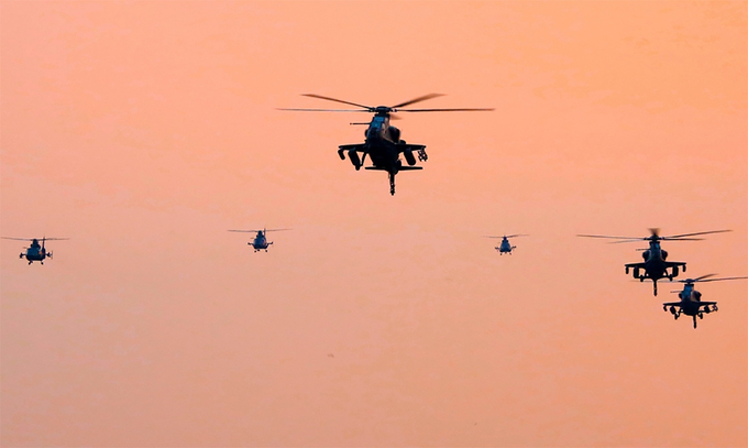 Các trực thăng tấn công Z-10 và trực thăng vận tải Mi-171 diễn tập khoa mục vượt biển công phá các vị trí phòng thủ của đối phương trên một hòn đảo không được xác định.