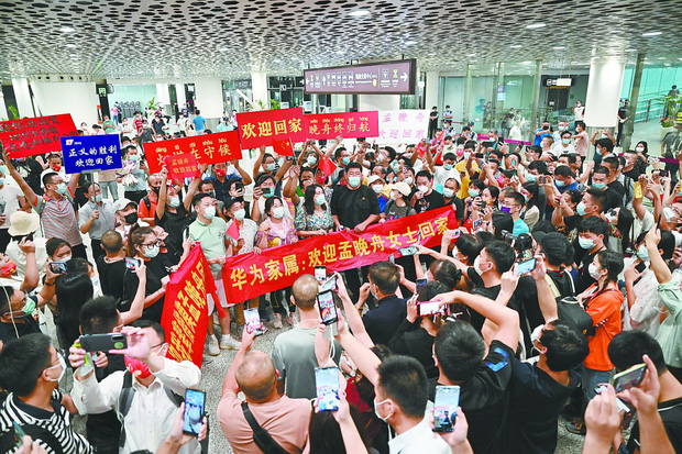 Giám đốc tài chính đế chế Huawei Mạnh Vãn Chu được chào đón tại quê nhà như một người hùng. Trong khoảnh khắc bước xuống máy bay, nữ doanh nhân được trải thảm đỏ chào mừng, hai bên là những người ủng hộ vẫy cờ Trung Quốc cổ vũ. Bà được đám đông chào đón vô cùng nồng hậu, nhiệt tình. Đi cùng chuyến bay về nước với bà Mạnh còn có Đại sứ Trung Quốc tại Canada Tùng Bồi Vũ.