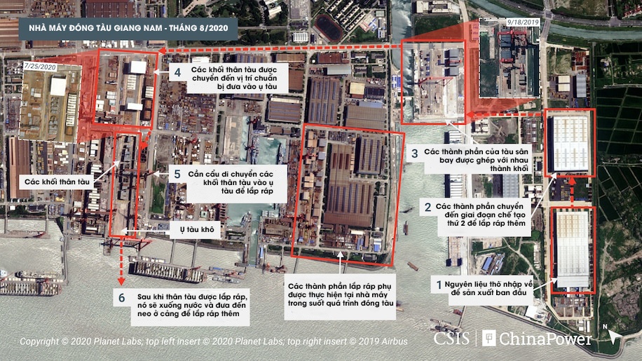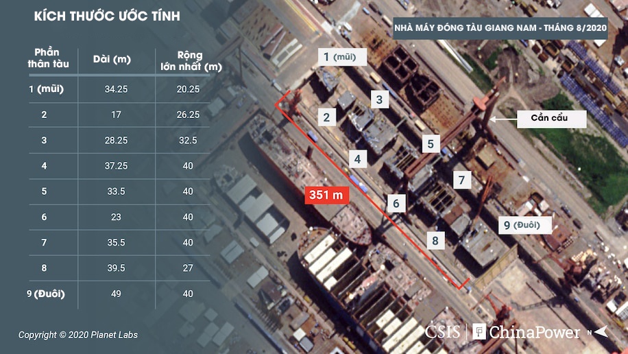 Hình ảnh vệ tinh do Trung tâm Nghiên cứu Chiến lược và Quốc tế (CSIS) công bố cho thấy các khối thân tàu đang được lắp ráp tại nhà máy đóng tàu Giang Nam, Thượng Hải, Trung Quốc. Nó có thể được hạ thủy vào tháng tới, để bước vào quá trình chế tạo tiếp theo, Washington Post cho biết.