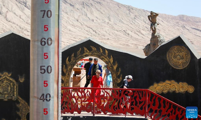 Du khách vừa đổ xô đi xem một nhiệt kế khổng lồ hiển thị nhiệt độ bề mặt tại Hỏa Diệm Sơn (một địa điểm du lịch nổi tiếng ở khu tự trị Tân Cương) theo thời gian thực là 80 độ C - truyền thông Trung Quốc ngày 19-7 cho biết.