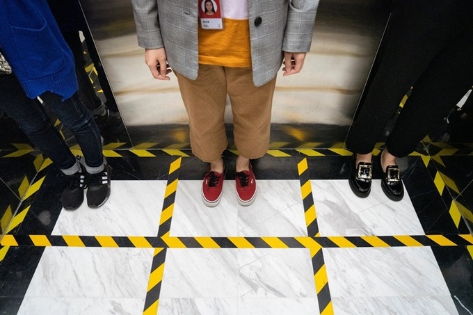 Thang máy được phân chia các ô vị trí đứng tại trụ sở JD.com ở Bắc Kinh, Trung Quốc. Ảnh: NYTimes.