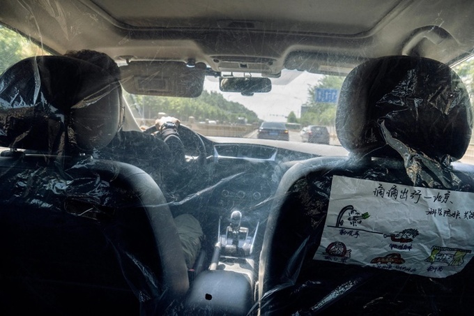 Tài xế taxi công nghệ Didi Chuxing dùng nylon để ngăn cách không gian với hành khách. Ảnh: NYTimes.