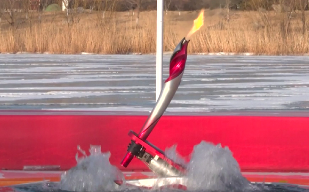 Một robot hình chiếc phi thuyền lưỡng cư đã tiếp nhận ngọn lửa từ người cầm đuốc số 254 và lặn xuống sông Vĩnh Định ở Bắc Kinh, trước khi truyền lửa sang một robot lặn khác. Robot thứ hai, sau khoảng 8 phút, đã nâng ngọn lửa lên khỏi mặt nước và truyền cho người cầm đuốc thứ 255.