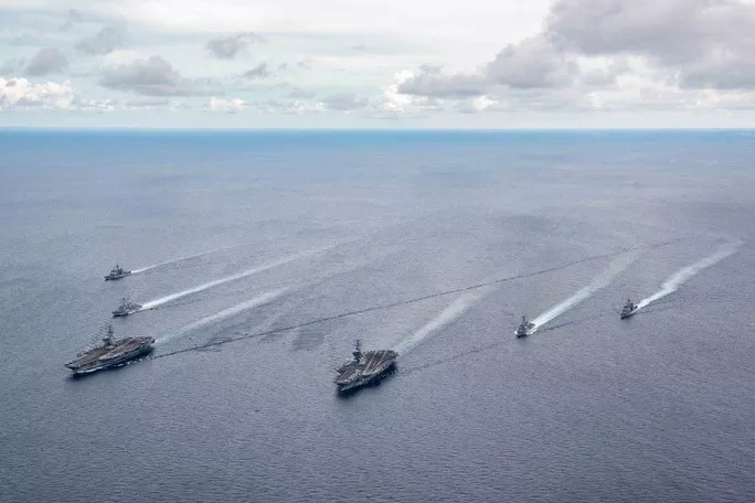 Nhóm tác chiến tàu sân bay Mỹ USS Nimitz và USS Ronald Reagan trong một chiến dịch đảm bảo tự do hàng hải trên biển Đông. Ảnh: EPA